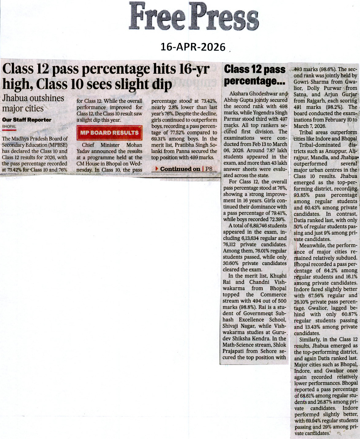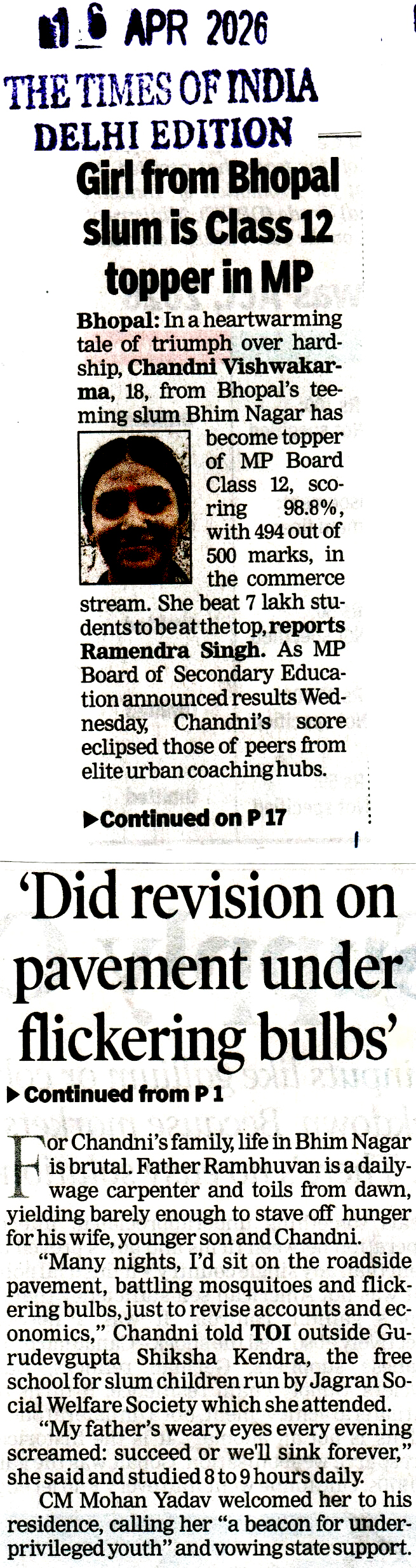 Girl from Bhopal slum tops MP ...
