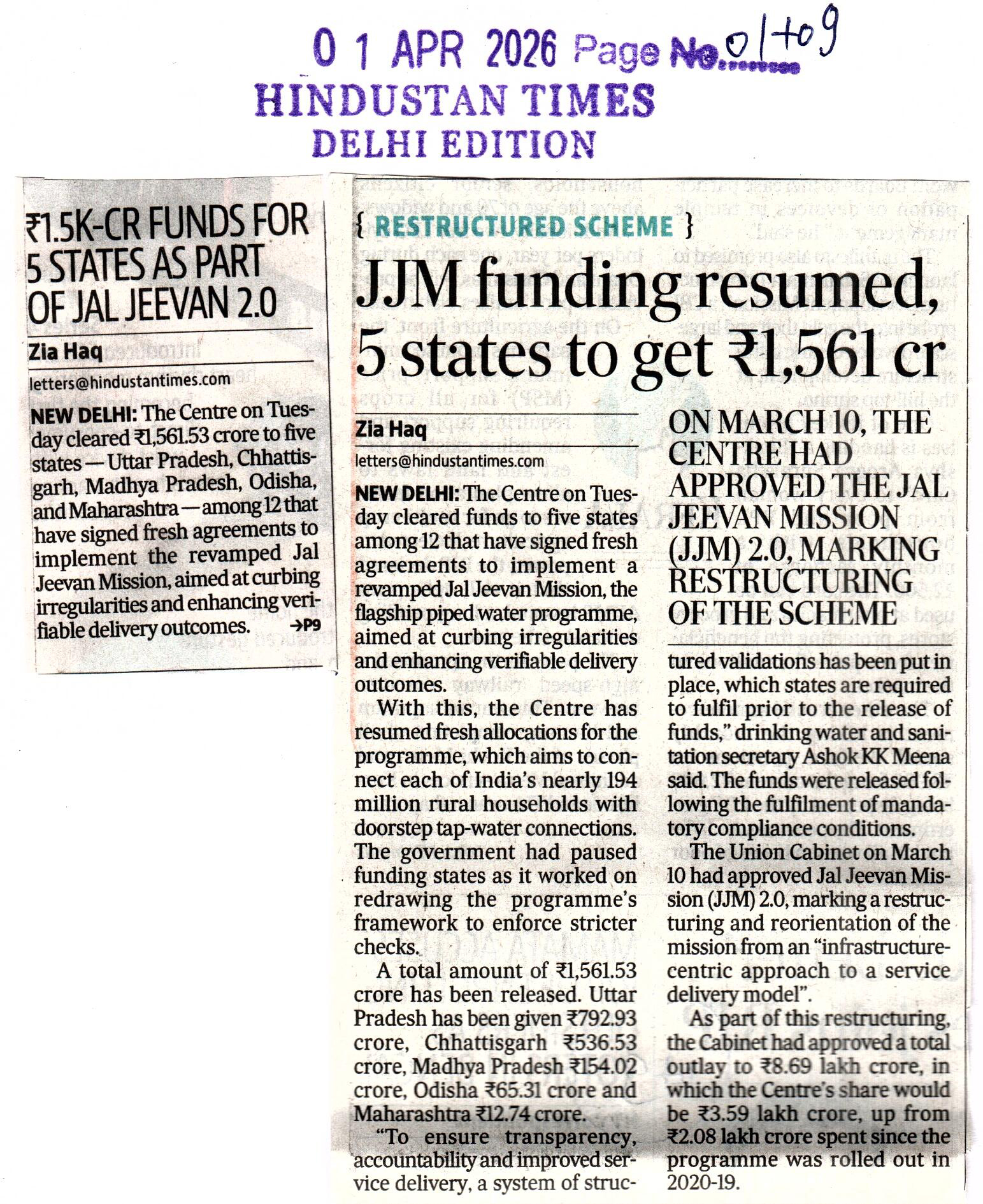 JJM funding resumed, 5 states ...